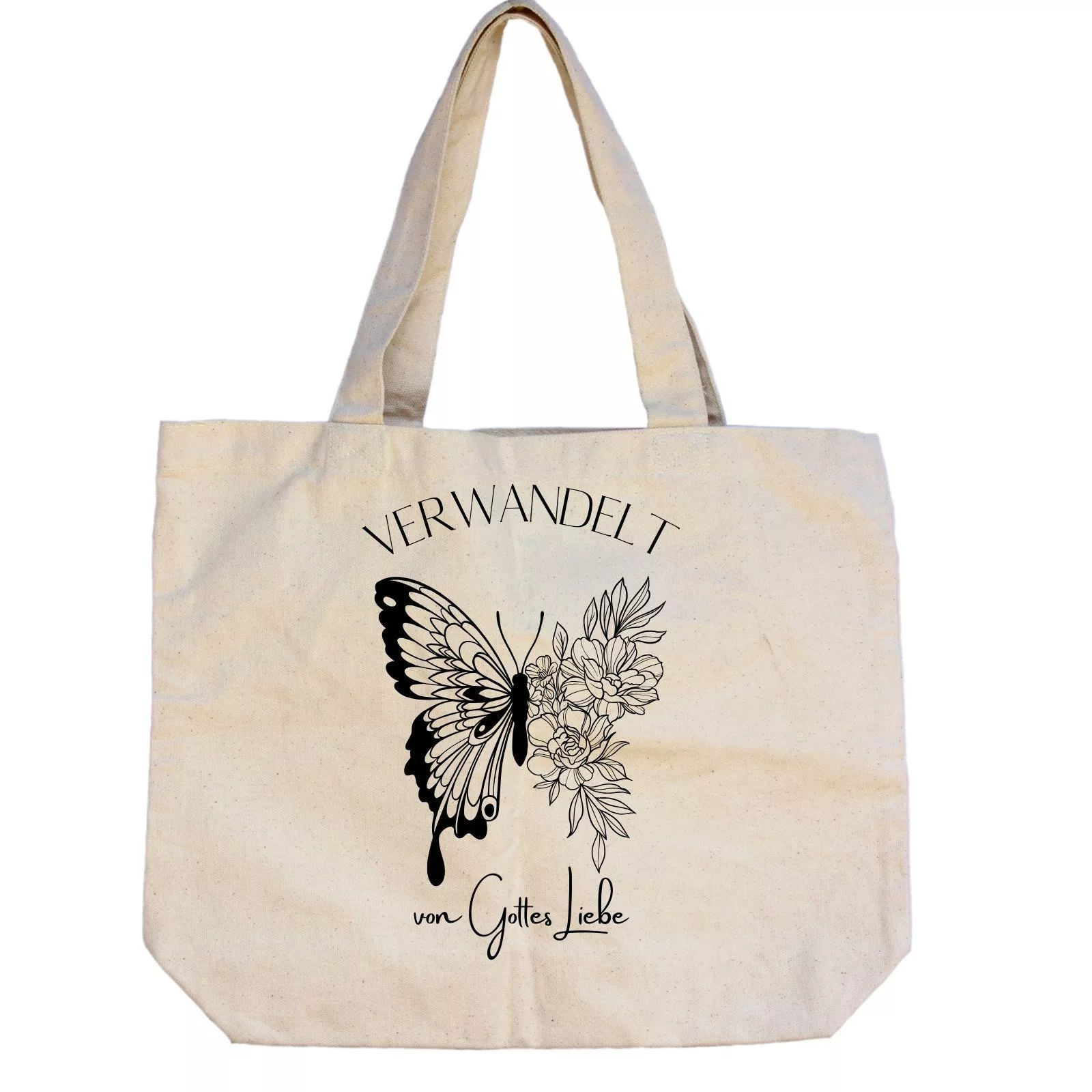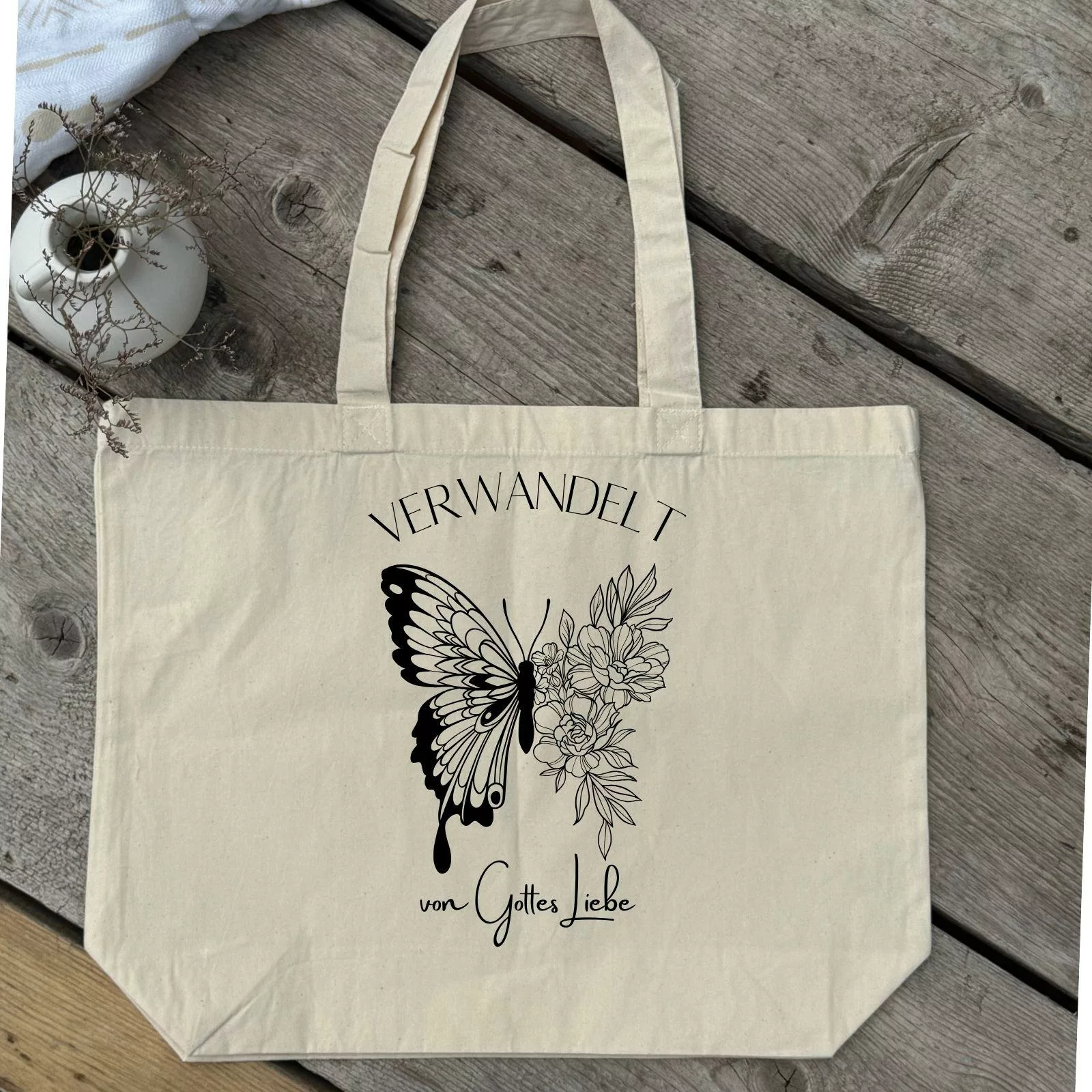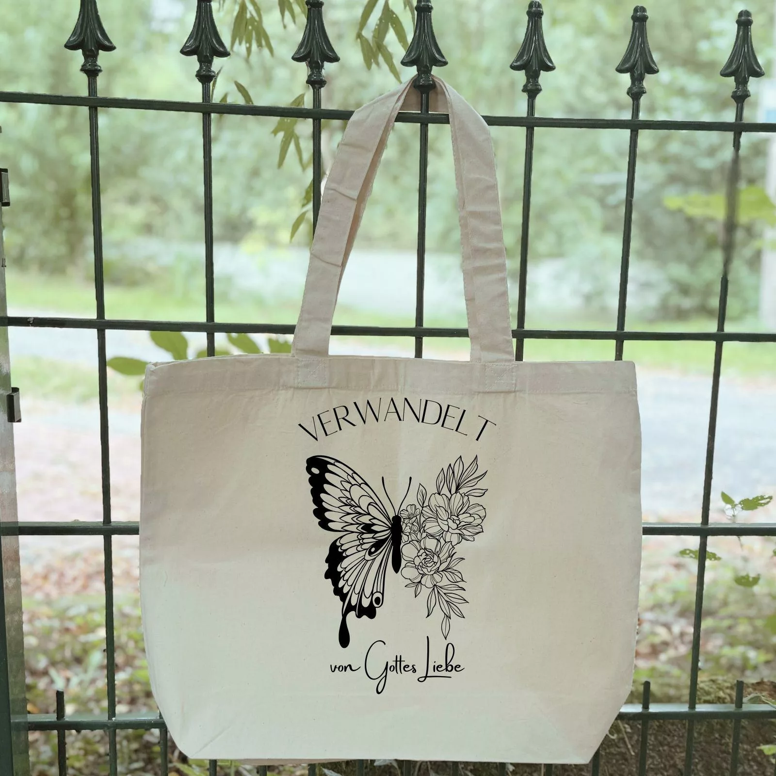 Große Baumwolltasche mit der Aufschrift: Verwandelt von Gottes Liebe