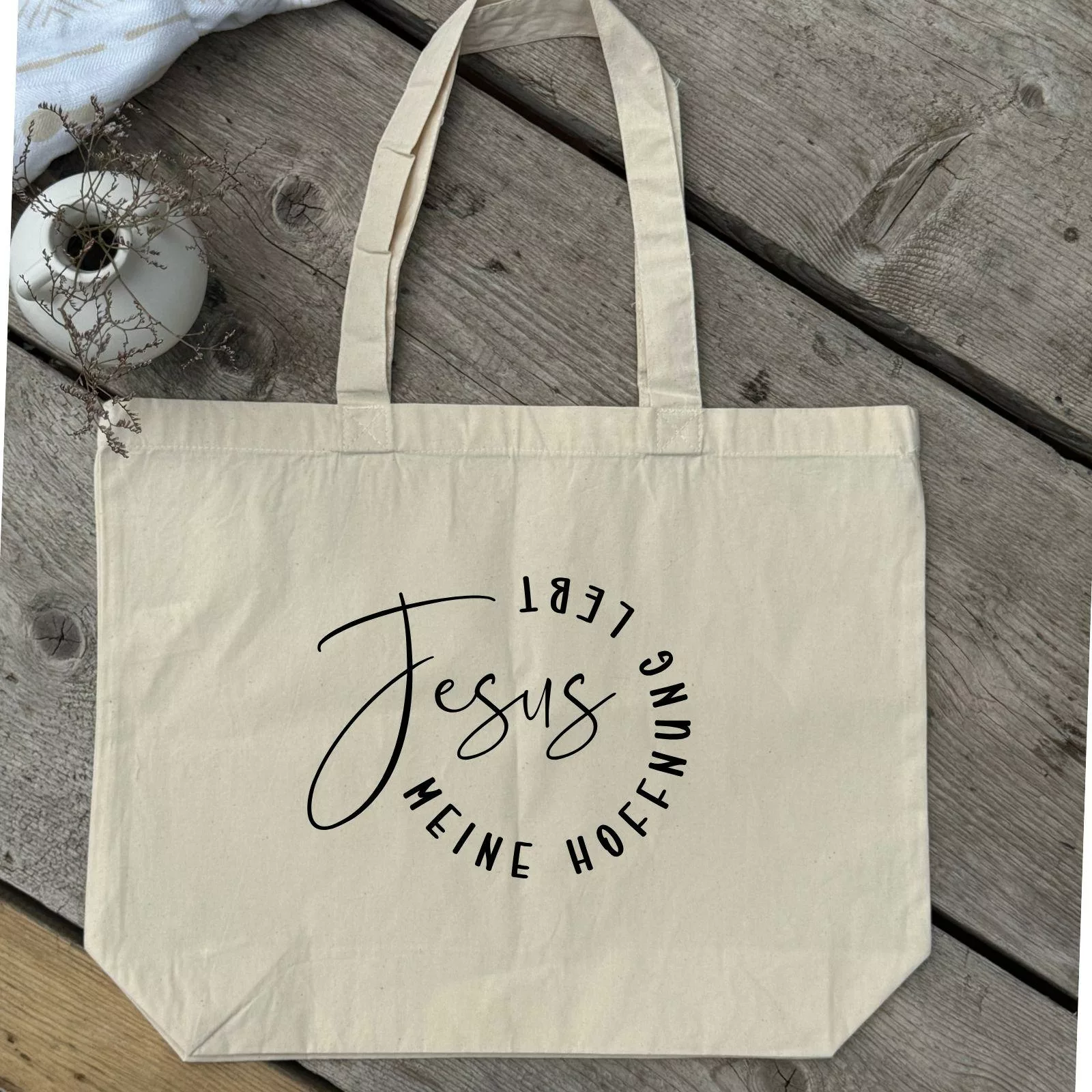Große Baumwolltasche mit der Aufschrift: Jesus meine Hoffnung lebt