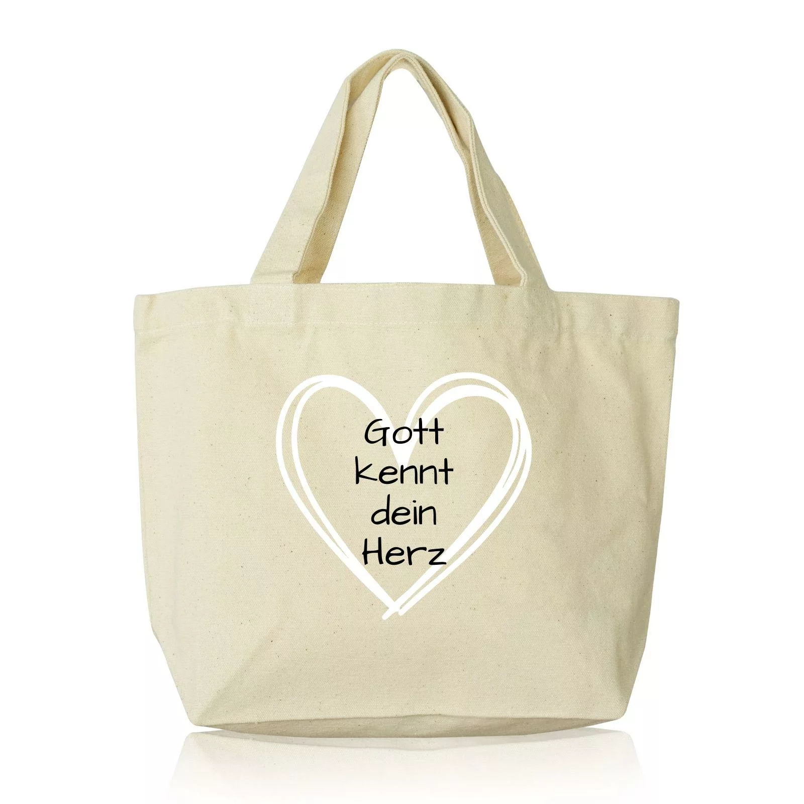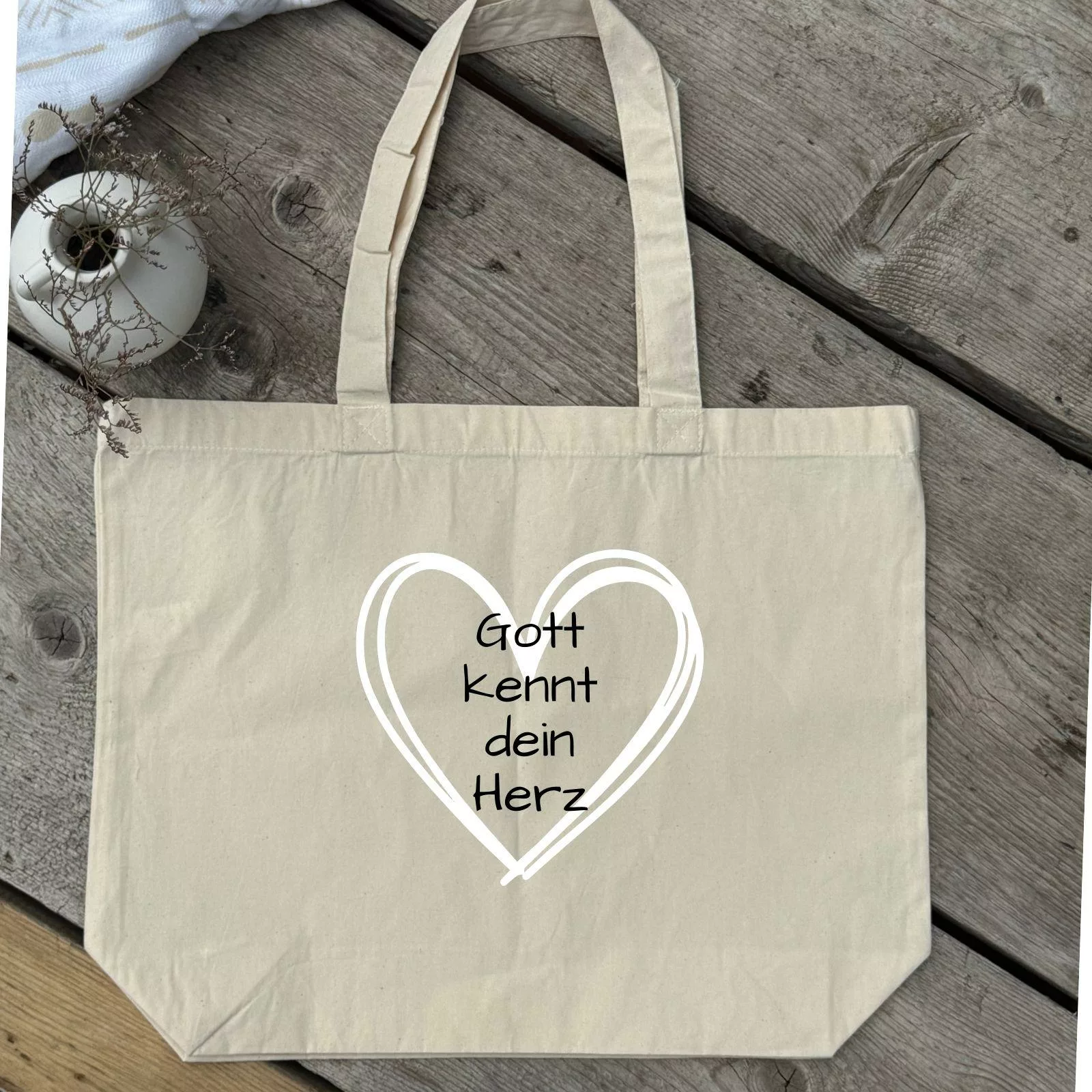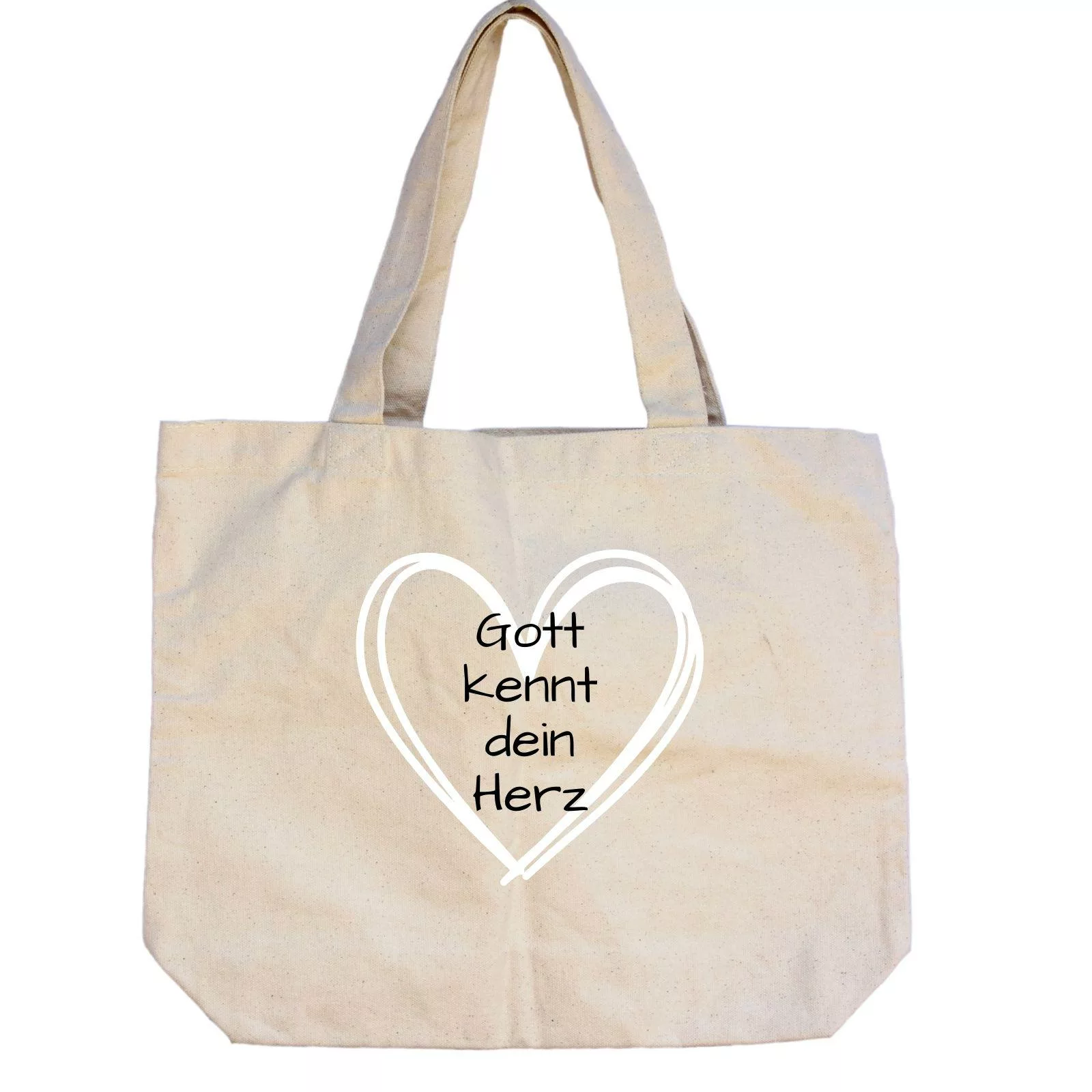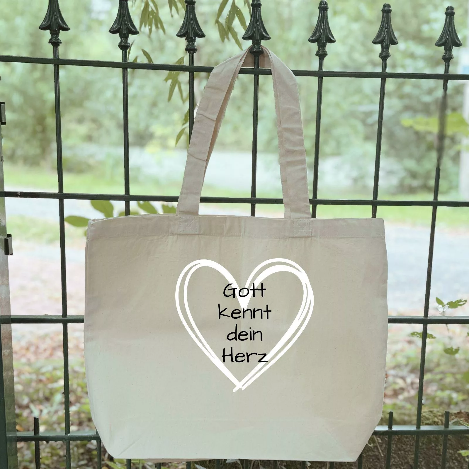 Große Baumwolltasche mit der Aufschrift: Gott kennt dein Herz