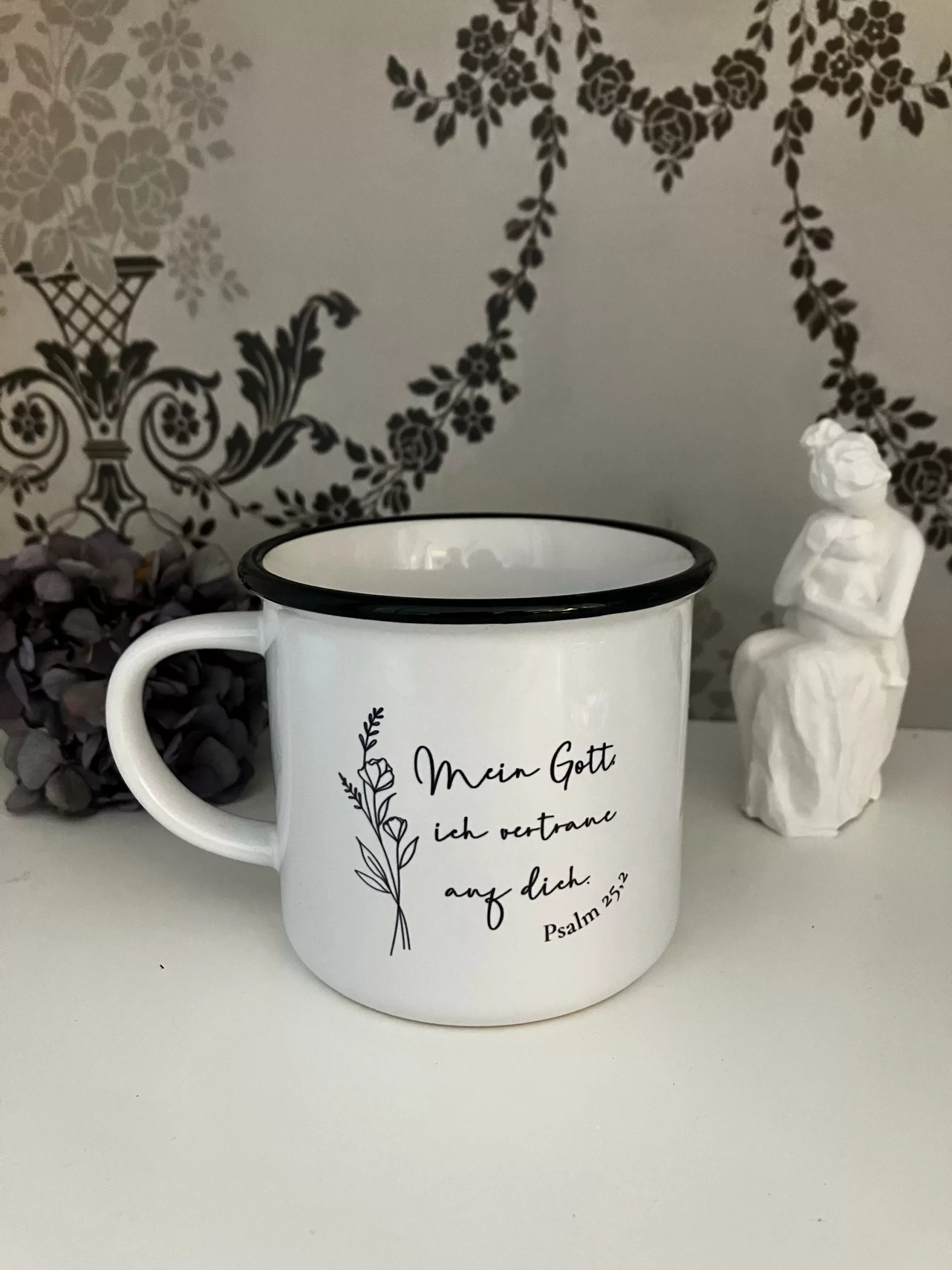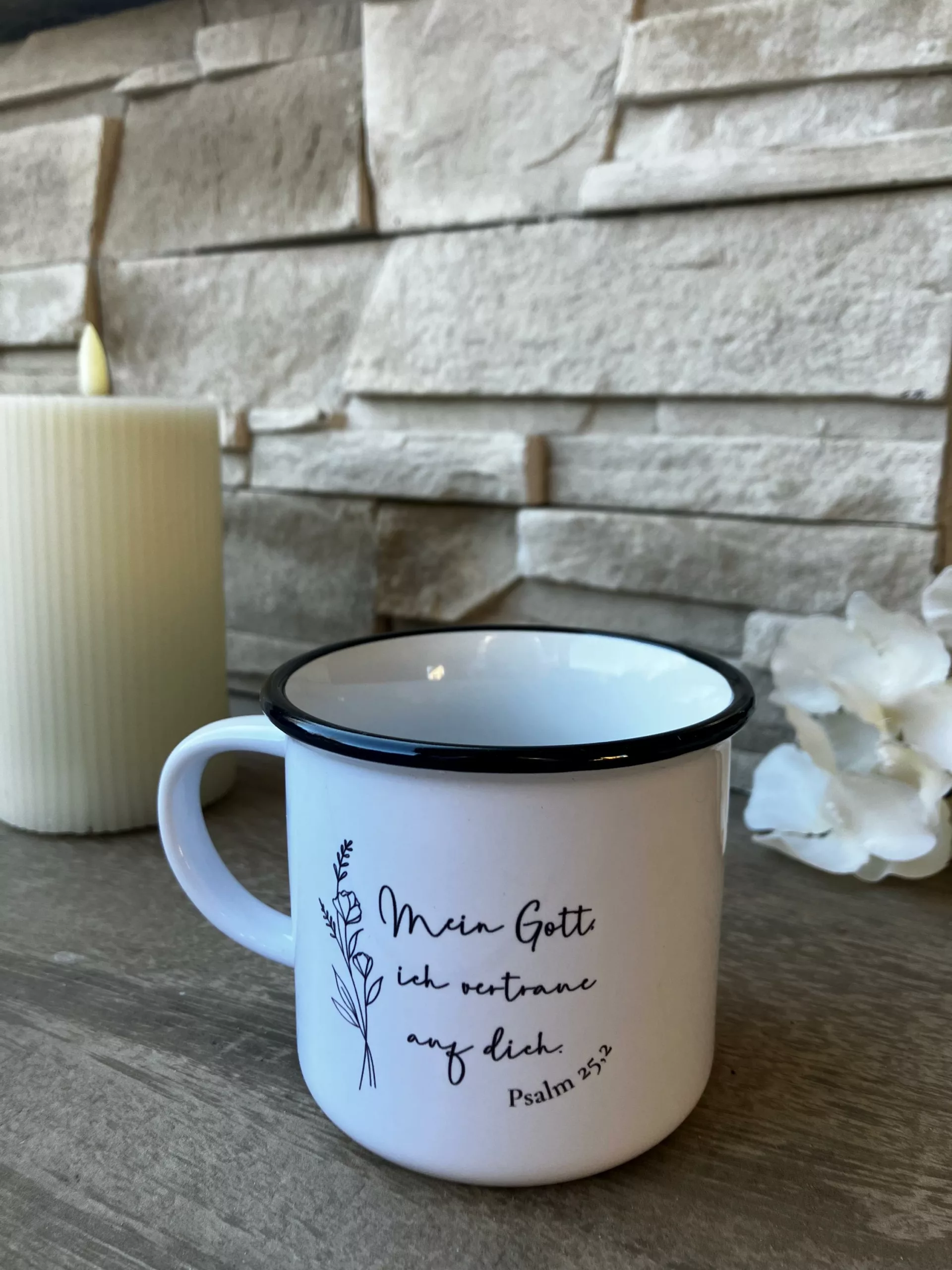 Weiße Keramiktasse mit schwarzem Rand im Emaillelook