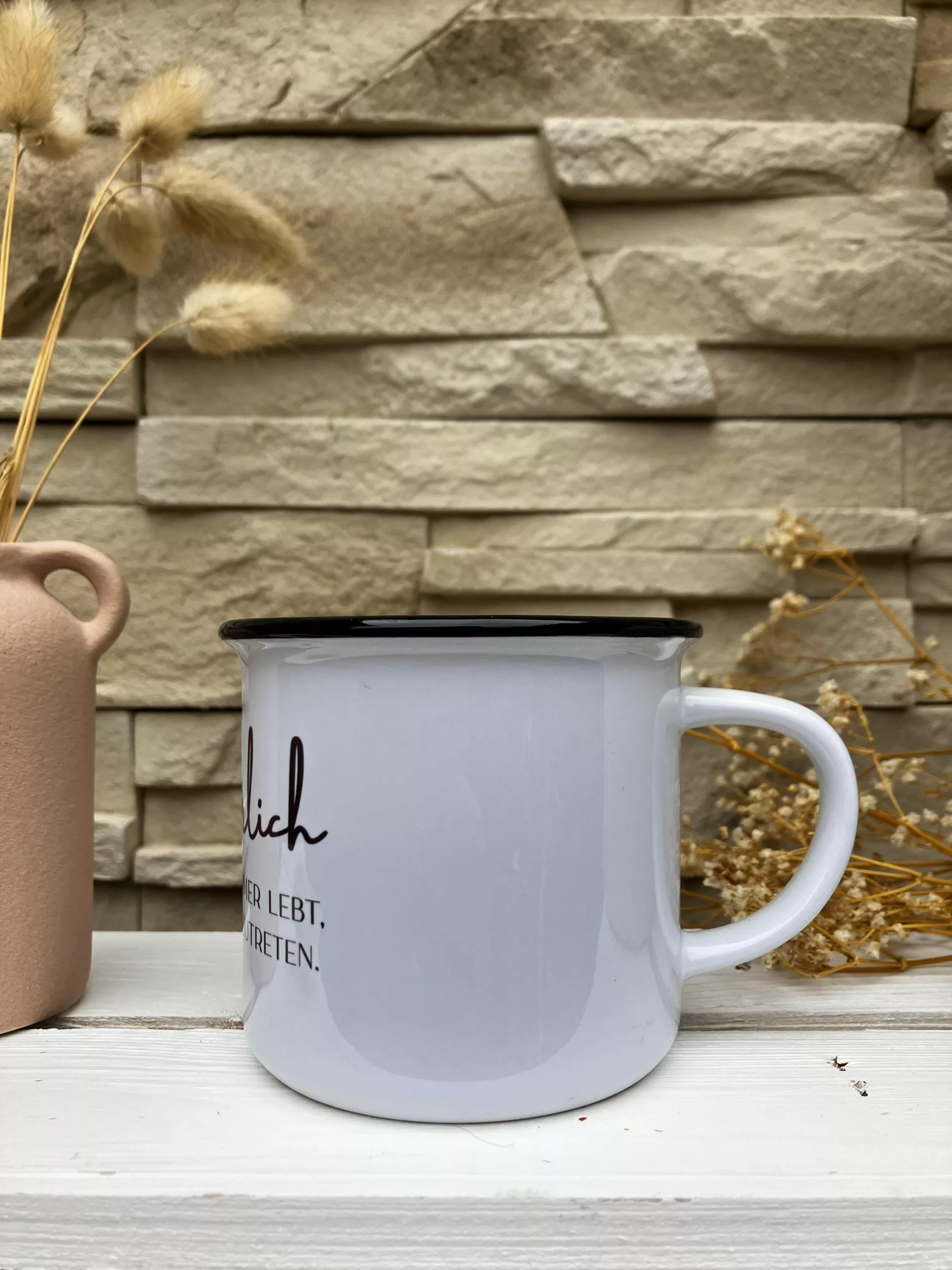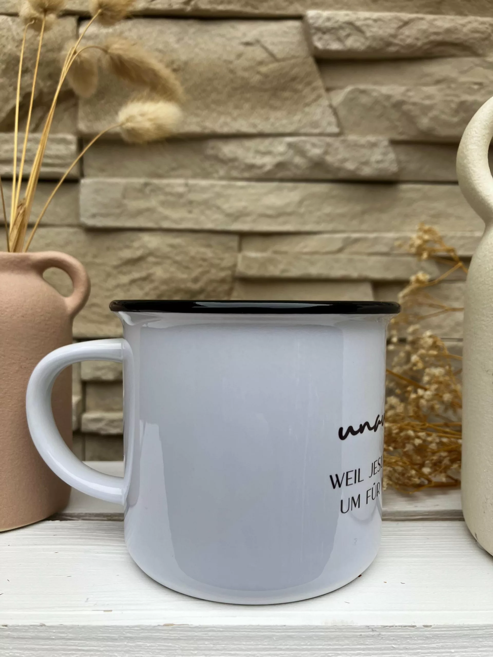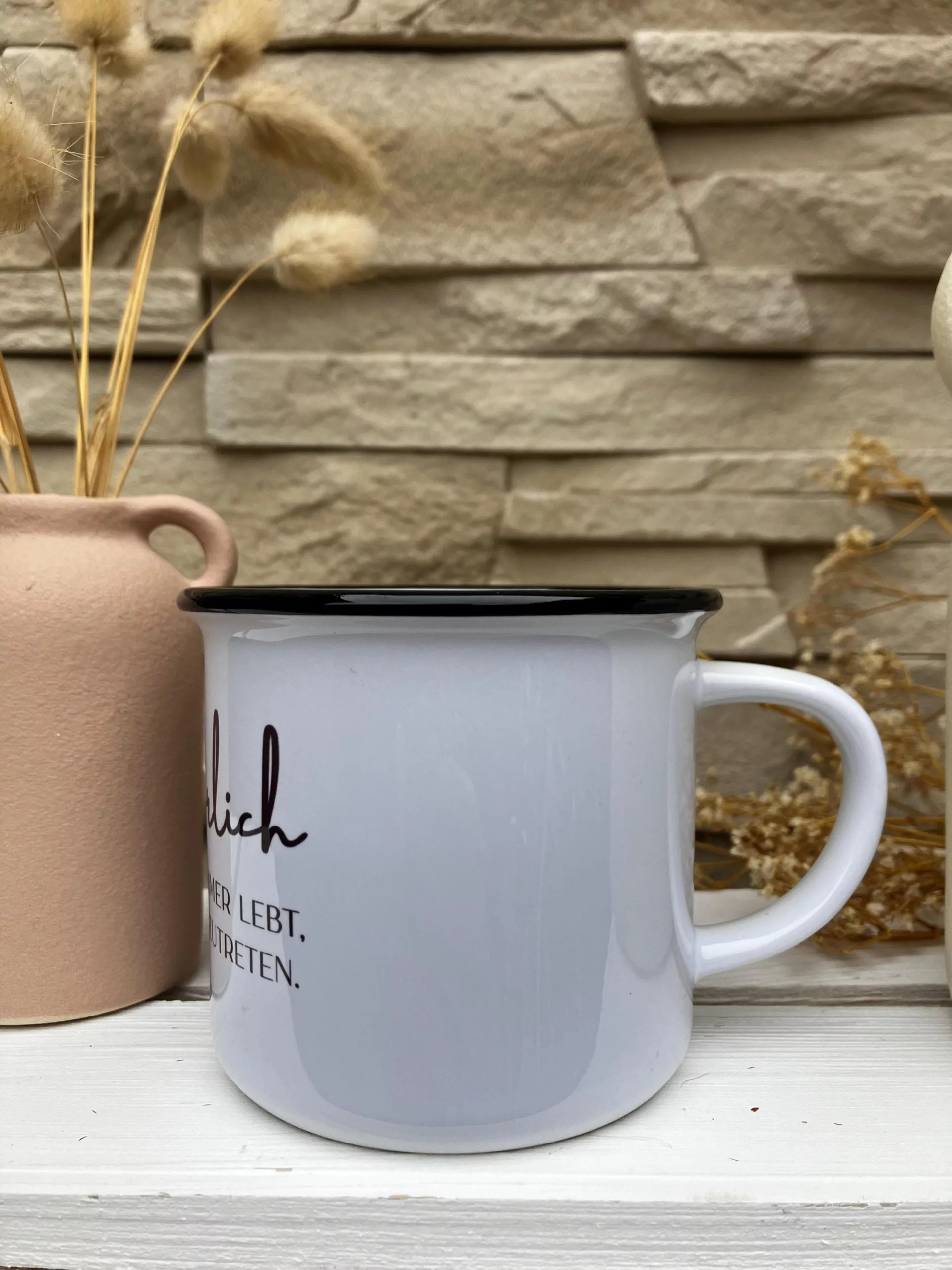 Weiße Keramiktasse mit schwarzem Rand im Emaillelook