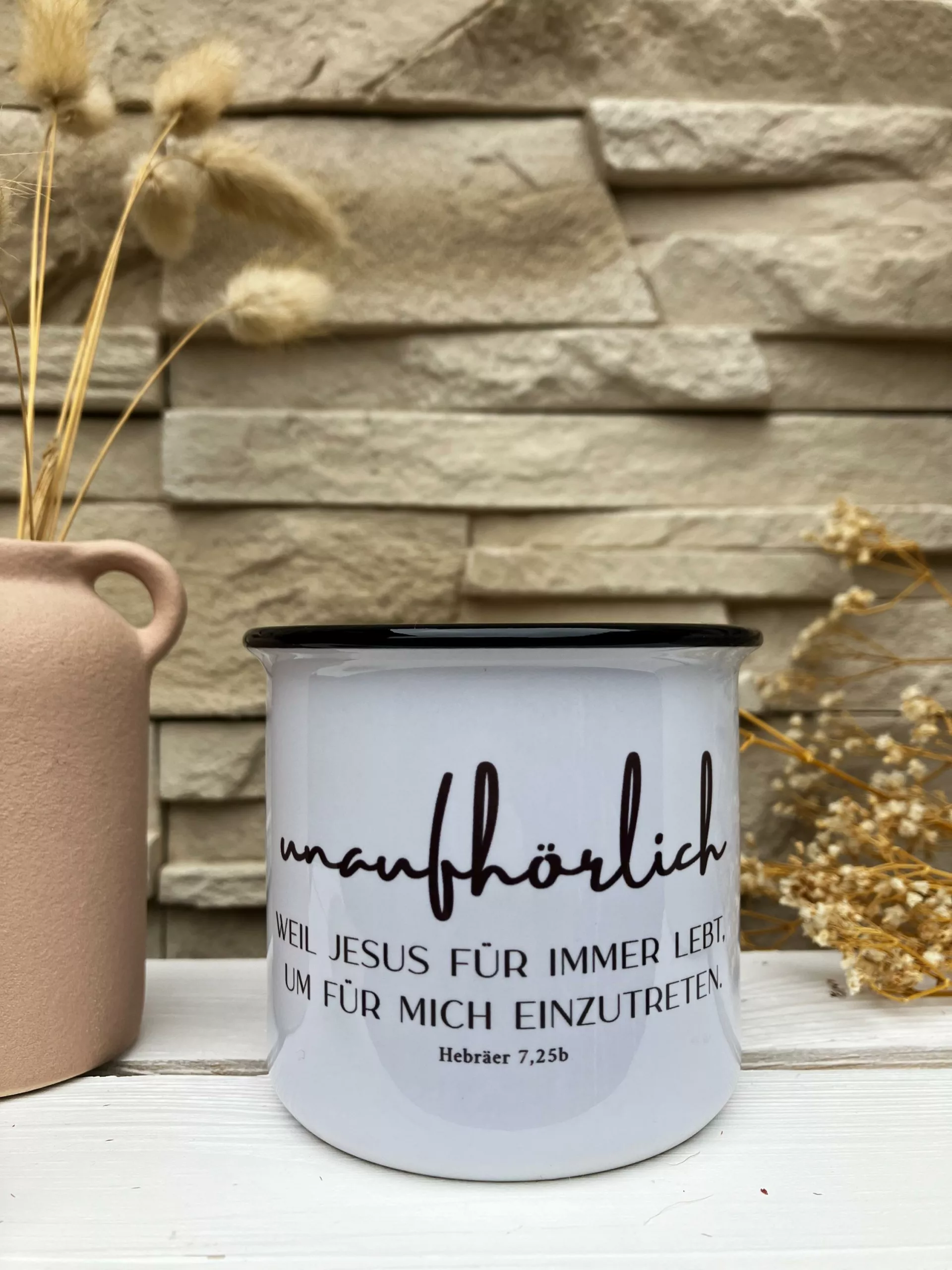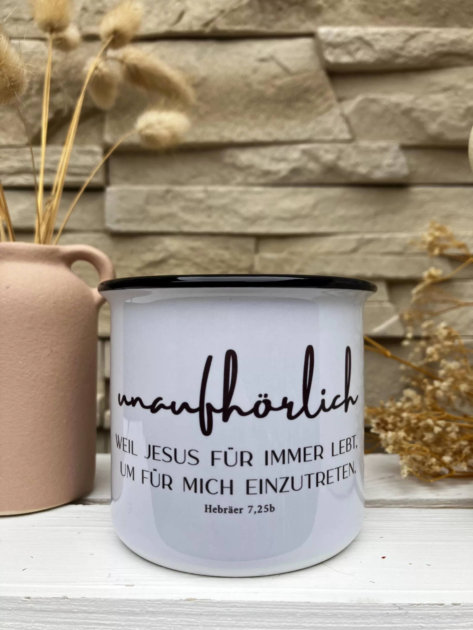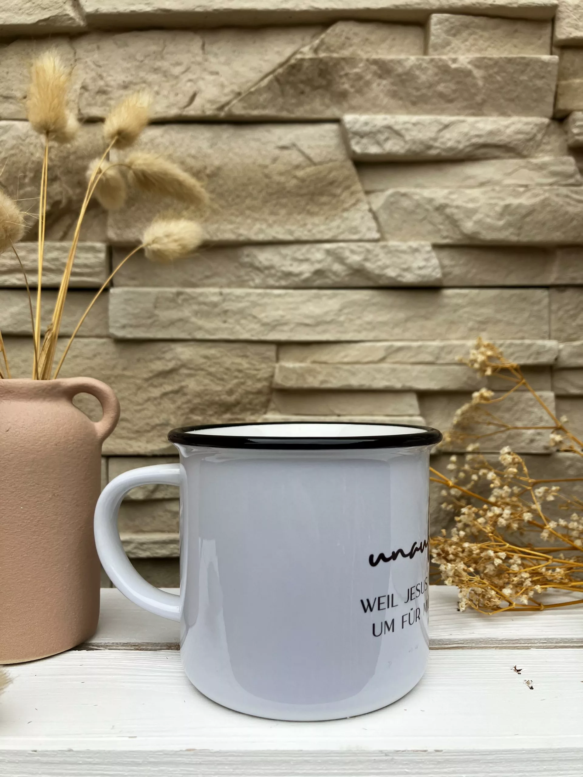 Weiße Keramiktasse mit schwarzem Rand im Emaillelook